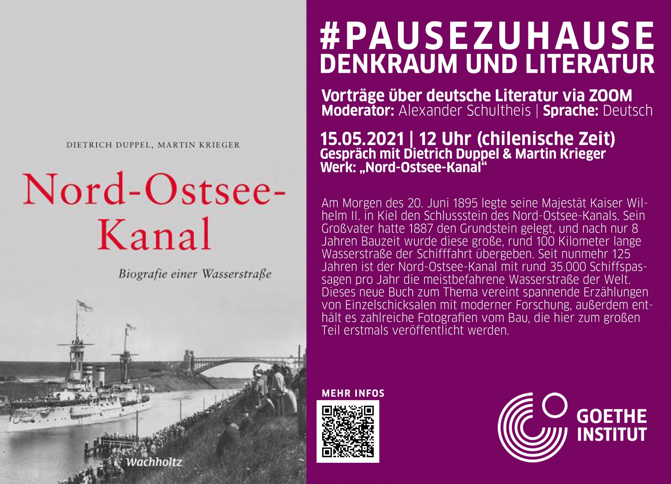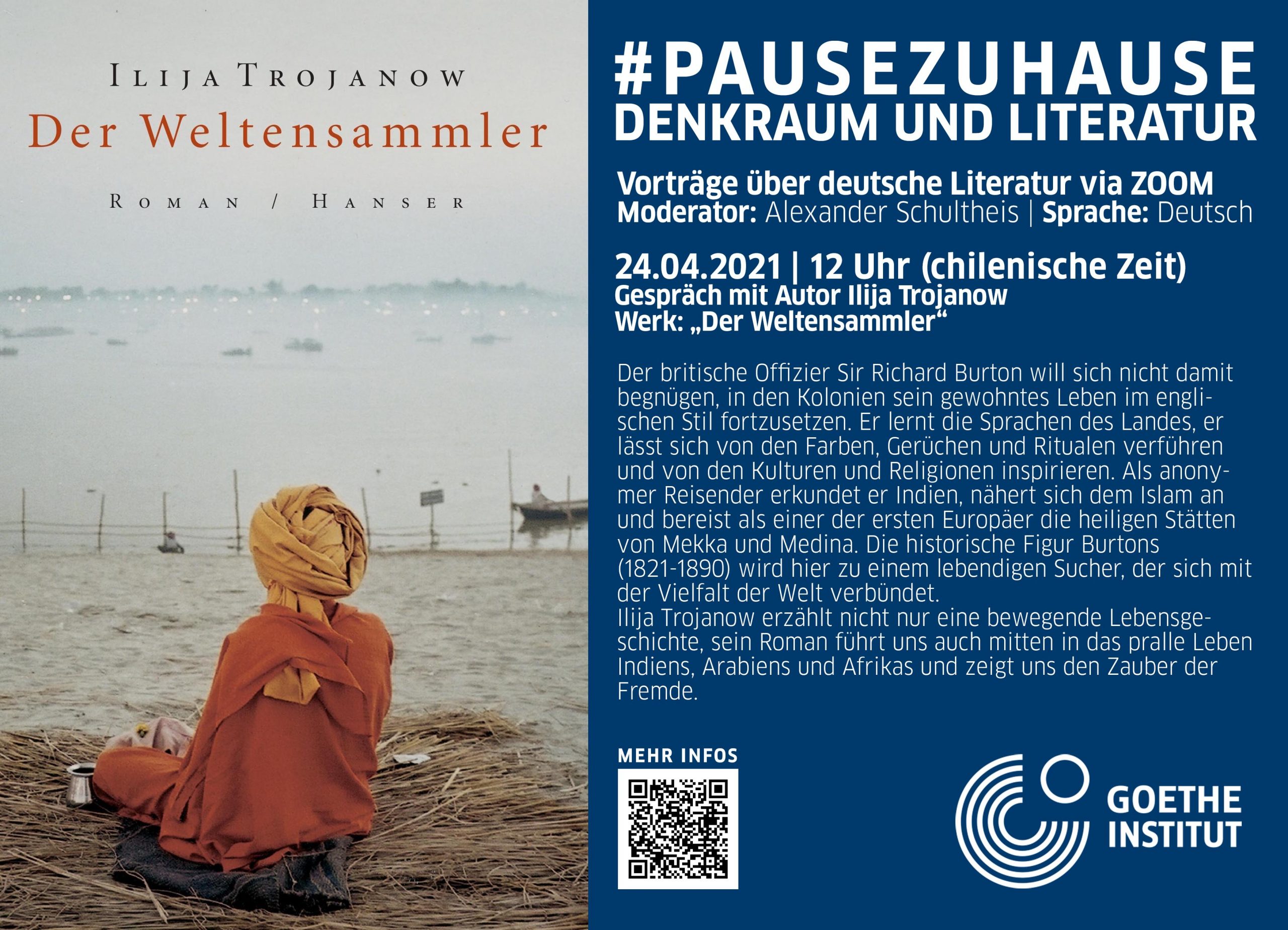 Jeden dritten Samstag im Monat ab 12 Uhr (chilenische Zeit) stellen die Bibliotheken der Goethe-Institute aus La Paz, Lima, Porto Alegre, São Paulo und Santiago deutsche Literatur unter dem Titel: #pausezuhause2021: Denkraum und Literatur vor.