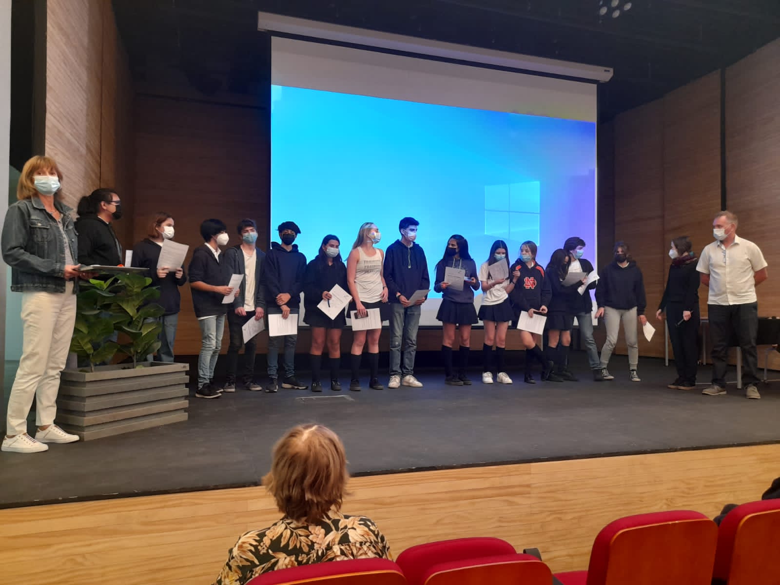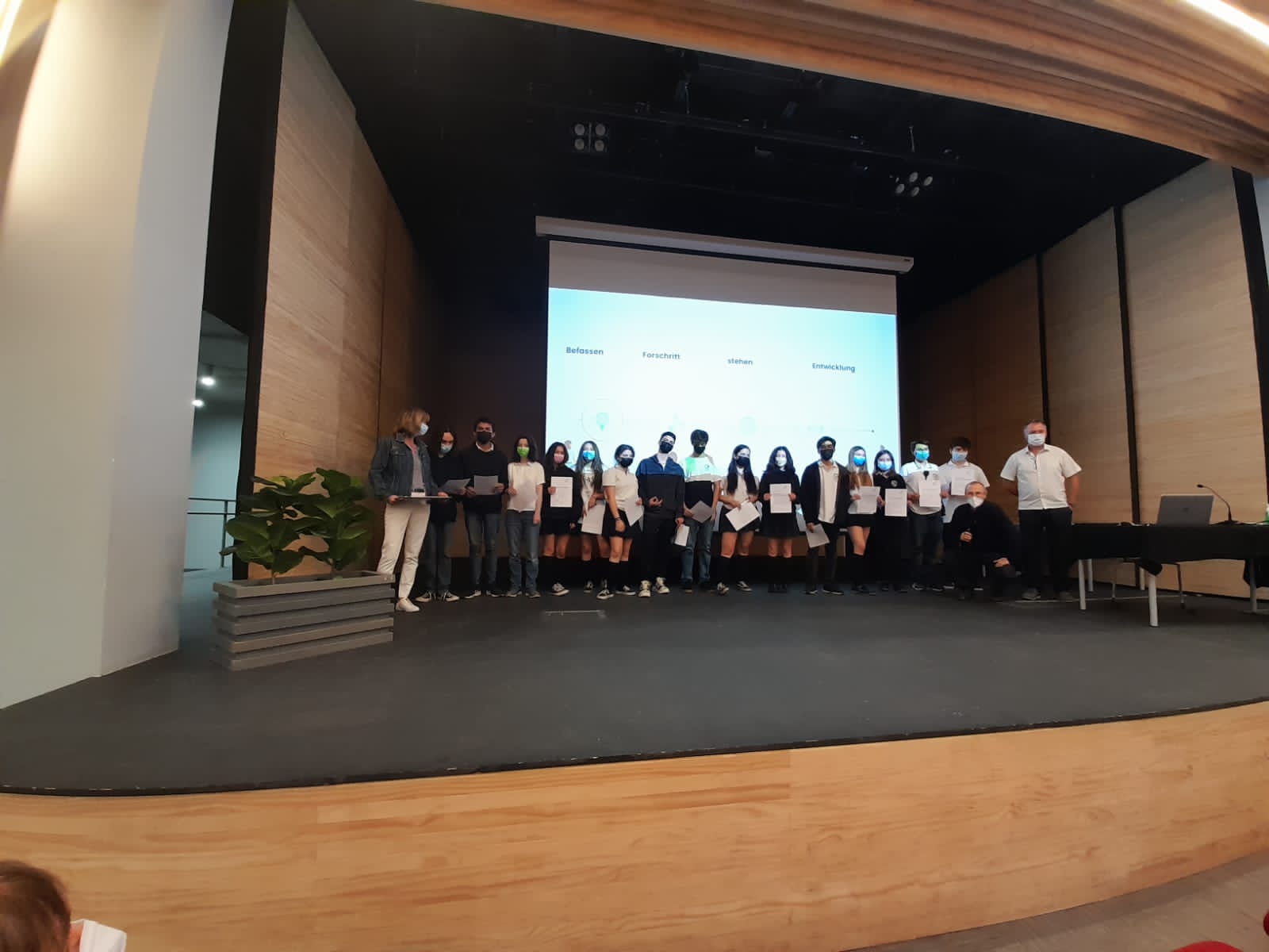 Im Rahmen eines offiziellen Festaktes überreichten die LehrerInnen Herr Adrian, Frau Barnahazi, Frau Böhmer und Frau González die Diplome und Bescheinigungen der DSD 1 Prüfung 2021 an ihre SchülerInnen der 10. Klassen. Zuvor richteten der Schulleiter, Herr George, und die Fachleiterin, Frau Ruf, anerkennende Worte an die SchülerInnen, in denen sie die Bedeutung der deutschen Sprache und des DSD 1 auf dem Weg zum DSD 2 betonten.