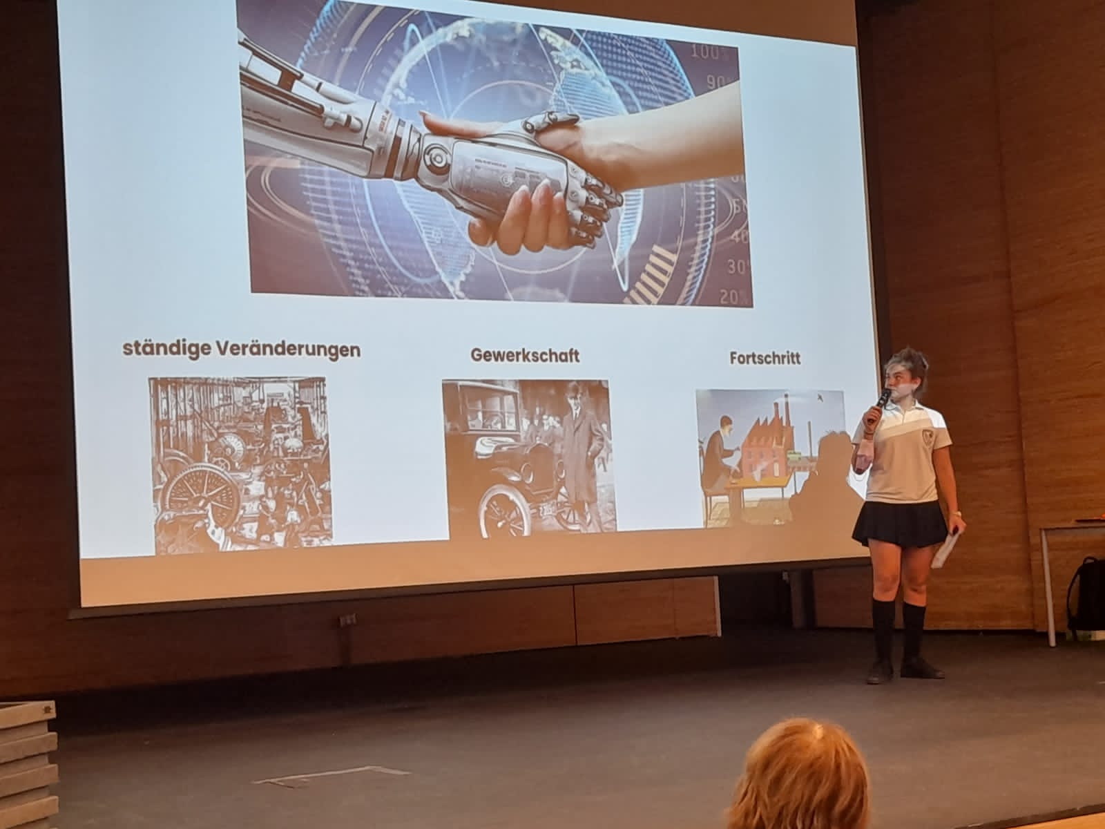 In Anwesenheit der 9. Klassen trugen zwei SchülerInnen der 10. Klassen ihre mündliche Präsentation der DSD 1 Prüfung vor, sodass die 9. Klässler vorab einen Eindruck des Prüfungsformates bekommen konnten. Für diese mutige und beeindruckende Leistung gab es einen großen Applaus – Vielen Dank an Constanza Roman und Nicolás Fariña (beide 10A)!